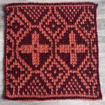 The Twin Crossroads Tunisian Square pattern was a happy accident when attempting to create a mosaic pattern. Although the pattern looks complicated, it requires to be familiar with tunisian simple stitch and changing colors. Stranded color work is well known among knitting, but it can be made in crochet as well. Rather than carrying the yarn along the back, there is a video tutorial included in the PDF that demonstrates how to change color on the forward pass and return pass without tangling the yarn. A chart is also included in the PDF.