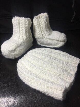 A gender neutral newborn set. Hat and boot cuffs match with a very stretchy twin rib. Seamless boots offer option of grafting or three needle bind-off at heel.