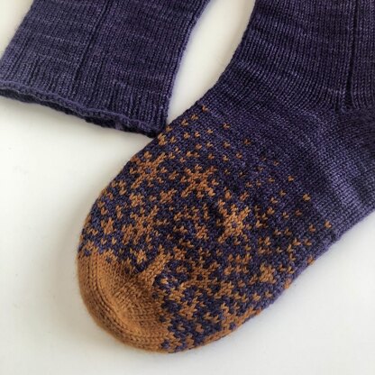 These socks are second in a series that aims to use a skein + mini set in ways that are more creative than just contrasting heels/toes. These socks are inspired by star gradients that were a trend in nail art.