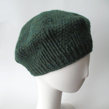 This is a great hat for solid or heather yarn. It has a beautiful twill pattern created by a simple drop stitch pattern on top. The bottom utilizes a twisted rib pattern to shape the hat for a tailored look.