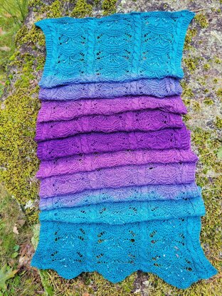 This wrap can also be knit from two skeins of A Hundred Ravens Patos light fingering in a tonal colorway instead of using cakes. A heavily variegated yarn is not recommended as the lace and cables wouldn't be visible.