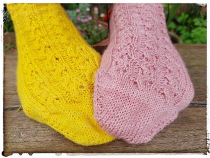 Construction: The construction is a toe up sock with a gusset and slip stitch heel end mid calf.