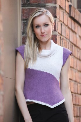 The stitches from the provisional cast on are picked back up to work an asymmetrical hem with use of sloped bind offs. Finally, the cap sleeves are created with top down in the round, short row shaping.