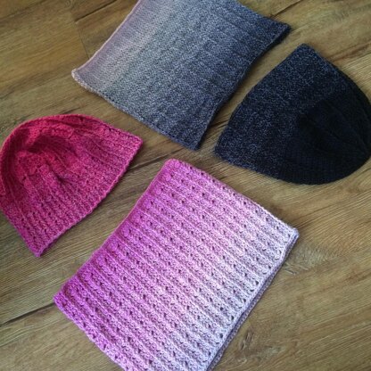 Patterns for two sets of matching hat and cowl, a plain 'ribbed' design and a lacier design. Both sets can be made from one Scheepjes Whirl (225g/1000m) which is a 4ply/fingering weight yarn.