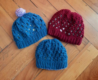 The brim of the outer part is knitted with ribbed stitched then the upper part is crocheted with a granny stitch.
