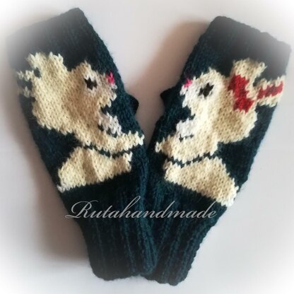Fingerless knitted gloves with 2 little bunnies using intarsia. Pattern wrote for adult S/M size, for bigger size you can add 2-4 stitches more Gloves are knitted with Drops Lima yarns, but any DK yarns are perfect.