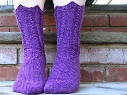 Adorn your feet with majestic socks! Whether you're a queen or merely a serf, everyone deserves to wear something resplendent. The cuffs are crowned with lace, and imperial cabled columns spiral down each leg before converging at the heel and instep. A smooth stockinette foot and modified wedge toe add a regal simplicity to balance out the detailed legs.