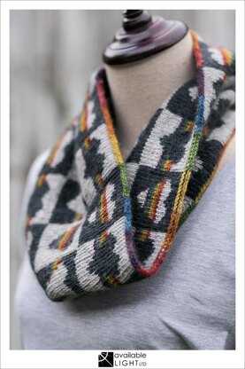 The cowl pictured is 36cm wide and 20cm tall (laid flat). To make you will need 1 ball of each grey, plus about 5-6g of each rainbow colour.
