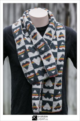 The scarf pictured is 120cm long and approx 25cm wide. A 180cm scarf can also be made by following the alternate length instructions. To make the 120cm length you will need 2 balls of each grey, plus about 10g of each rainbow colour. To make the 180cm length, you will need 3 balls of each grey, and approx 15g of each rainbow hue.