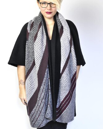Knit on the bias, this large and cozy scarf or cowl features alternating sections of two-color brioche and stripy texture. It is surrounded by an i-cord for a neat and finished look. Because of the diagonal sections, it looks different every time you wear it and because it’s reversible, you’ll always have the right side facing out.