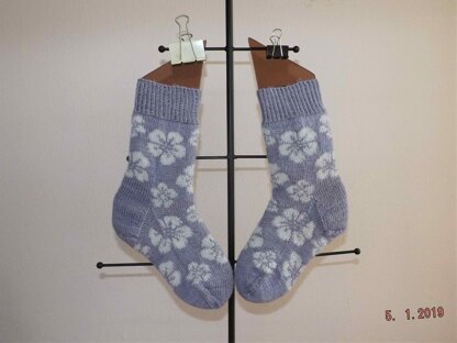 Udfordring is a pair of socks with a flower pattern worked in 2-color double knit - worked from the cuff and down.