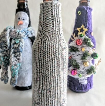 Adorn your ale! This stockinette beer sweater is a blank canvas for letting your inner elf run wild with sequins, ribbon, jingle bells— go nuts! Use plain worsted yarn or something sparkly or multi-colored. Try stripes for a candy cane look. Keep it classy, or go full Griswold, but whatever you do, have fun!