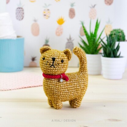 Ugo is a crochet cat who stands on his 4 legs, with upturned tail and a collar with a tiny bell. This amigurumi cat is worked in one piece starting from the head, there are only a few seams to do to complete it!