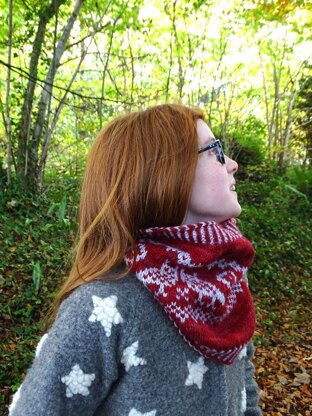 This two color cowl is worked in the round from the bottom up. The border edge is worked in two color slip stitch ribbing before short rows shape the cowl, creating a narrower back and a generous front. The owl motif is worked in Fair Isle colorwork in the round using two colors before more short rows and two color slip stitch ribbing complete the cowl. The pattern gives two options for cast ons, please use your preference.