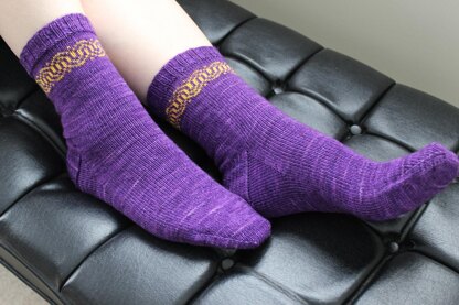 The basic cuff-down stockinette sock gets an upgrade with a band of swirling colorwork in a contrast color. Gather up your favorite sock yarn scraps or mini skeins for the colorwork -- or get two skeins of the recommending yarns and knit up two coordinating pairs, switching the colors. Sized to fit the whole family!