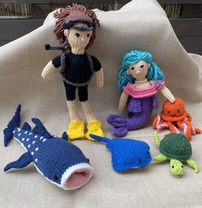 Welcome to my little knitting pattern for an under the sea collection; including adventurous diver doll, mermaid and a collection of animal friends including a sea turtle, manta ray, whale shark and an octopus.
