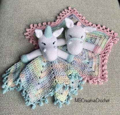 2 in 1 pattern! This patterns shows how to make a unicorn or horse lovey. Included is 11 pages of step by step instructions of how to work up all parts of this project with pictures included. The horn, horse bridle, wavy hair, star blanket and border are all included.
