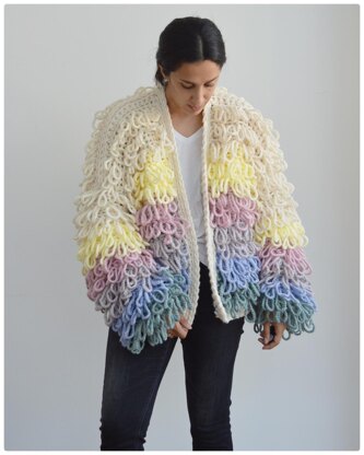 The Uni corn Loopy Cardi is worked seamlessly, to reduce bulk as much as possible. Instructions and a photo tutorial of the loopy stitch in included in the pattern. The hardest part? Picking the colours!