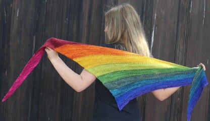 Unicorn Travel is a multiple color triangle shawl that is knit sideways.