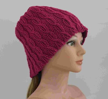 Hat features a crocheted cable pattern utilizing slip stitch crochet.