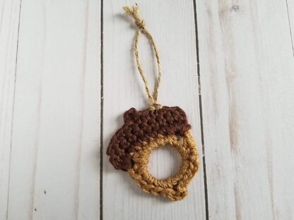 You will need a G/6 (4.25 mm) crochet hook, worsted weight yarn, packaging twine (optional) and how ever many 1” plastic rings you would like to make into acorns.