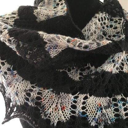 This is a tailored, sophisticated design. Use this scarf/shawl as an accent for everything from a designer pantsuit to your favorite jeans. It's perfect for lunch with the girls or a job interview! Black and speckled white yarn creates soft graphics, not too difficult to accomplish colorwork... the lace is original, I nearly always chart my own lace designs.