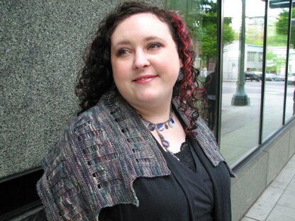 Urbanity is an arc-shaped shawl to go around your back and over each shoulder to show off the stairstepping edge on the front. It is knit from the top down with garter stitch surrounding the skyline-inspired tiers. This pattern uses a special method to bind off each tier and pick up stitches for the next tier, forming a chain-like edging.