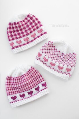 These adorable Valentine Plaids Hats are a fun knitting pattern that you can customize in any of four sizes for your baby or toddler. This cute fair isle baby hat knitting pattern has three different plaid patterns combined with a sweet row of hearts around the brim. Your little one will be ready for Valentine's Day! These baby hat knitting patterns are knit in the round and require basic knowledge of stranded knitting.
