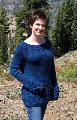 Valhalla is boatneck pullover featuring an Entrelac yoke and bands. Worked in the round from the top down with a slightly open fabric to offset the weight of the Entrelac panels. To escape the monotony of rectangular Entrelac scarves and shawls, I designed a modern fitted sweater that uses those addicting little rectangles.