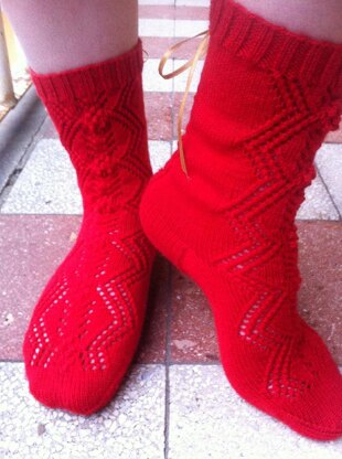 Lace socks that lace up! This sock features a lace panel and a slightly unusual construction as it is knit flat till the heel flap, then joined, then continued as a standard, top-down sock.