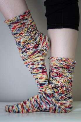These socks start off with a knitted, Picot CO that leads to a 1 x 1 ribbed cuff. The leg section may look daunting, but easily explained Caliper Cable Loops are slipped a few rows up to create that spectacular look. Because of this special construction, these socks must be knit on double pointed needles, one at a time.