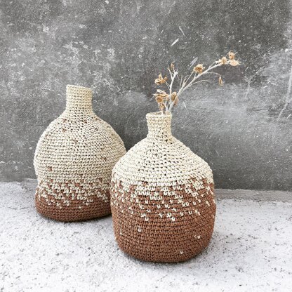 • Yarn: Raffia (100 gr ± 150 m) For the the bigger vase 200 gr Raffia : 115 gr color a (natural) + 85 gr color b (brown) For the the smaller vase 125 gr Raffia : 45 gr color a (natural) + 80 gr color b (brown) • Crochet hook size 3.00 mm/US5 • Tapestry needle • Scissors
