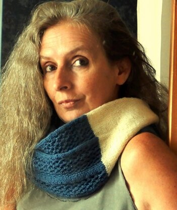 The cowl is a long tube that is worked in fingering weight yarn. It is a lightweight accessory that takes some time to knit, but will feel heavenly soft around your neck. There are no special difficulties hidden in the pattern, it is a very relaxing knit. Use one color, use two colors, knit to any desired length, do as you please.