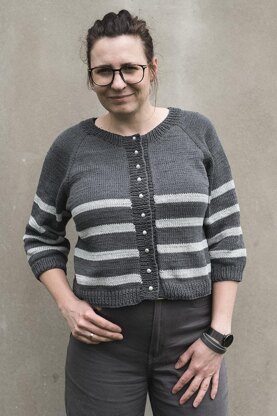 The Venice cardigan is a hip length style knit with a crew neck and 3/4 narrowing sleeves. Cardigan body and sleeves are worked in different colour solid stripes. This sweater has a neckline and is worked top-down in Stockinette stitch pattern in raglan using increases M1L and M1R. Front edge is worked only after knitting the whole sweater. Neck, cuffs and hem are worked in Rib stitch pattern. The body of sweater is worked straight, therefore it can be easily made longer - so more yarns should be estimated.