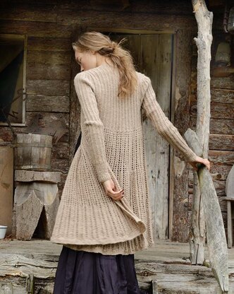 The Venus coat is a stylish, elegant garment and is Kari-Helene’s favourite piece of the new collection. Inspired by the ‘empire line’ in costume history, the skirt of the coat flows from the bust line into a fabulous flared skirt. The body is knitted in one piece (so there are no side seams) and the neckband and button edging is included within the rows and lace knit pattern. Venus is an interesting knit for the more experienced and accomplished knitter. It is a beautiful, feminine coat and the fullness and weight of the Venus skirt makes the coat sway gracefully as you walk.