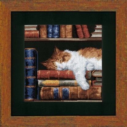 Vervaco Cat Sleeping On Bookshelf Cross Stitch Kit - 26 x 26 cm