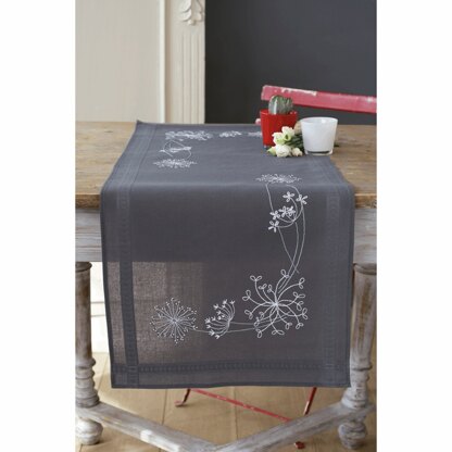 Design à broder en fils de coton sur un chemin de table pré-fini gris foncé, 60 % lin/40 % polyester, avec bord ourlé. Le dessin imprimé disparaîtra au lavage. Le kit inclut également un diagramme, une aiguille, des instructions et une photo de la page de couverture. Taille finie approximative : 40 x 100 cm (16 x 40 po).