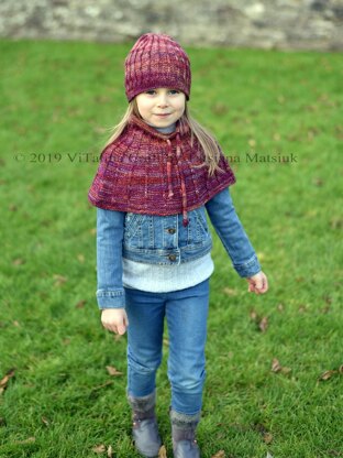 Verve hat and cowl set is perfect pair of accessories for cold autumn/winter days. The cowl is designed to be worn around shoulders over the coat. Both hat and cowl are knitted in the round on circular needles in combination of stockinette stitch and vertical rows of slipped stitches on reverse stockinette background. The cowl is decorated with I-cord tie which is inserted into top part of cowl.