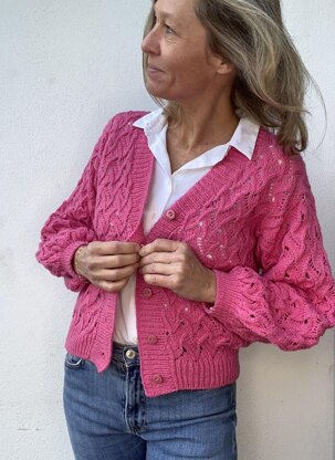 VesterbyCrea No 40 Cardigan is a cardigan worked in lace pattern. The model is worked top down. In the beginning of the yoke the back is worked in lace pattern. The front pieces are worked one at a time in picked up stitches from the top edge of the back piece. Decreases are worked on each front piece to create the V neck of the cardigan. The body is created by joining the front and the back piece and then worked flat in lace pattern. The body is finished with a ribbing and stretchy bind off. The sleeves stitches are picked up along the armhole and then worked in the round in lace pattern and finished with a ribbing and tubular italian bind off. Then stitches are picked up along the front edges to create a wide button band in ribbing. Buttons are sewn onto the button band. The cardigan is seamless.