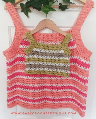 This top is made from the top down using v stitches and can be made cropped, longer, or it can even be continued to dress length, depending on your style.