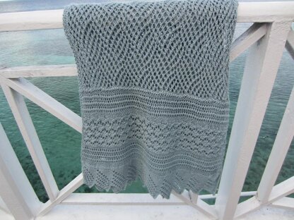 Vieux Carré is a rectangular stole worked in sections. The first edging is knit, then stitches are picked up along the length to work the body of the stole. Additional stitches are cast on and the second edging (which is slightly different than the first) is worked, the attached edging casting off the body stitches.