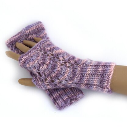 A quick and easy knitting pattern for pretty fingerless mitts in vine lace with ribbed cuff plus garter stitch edging and thumb.