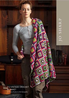 A cuddly blanket made from brightly coloured crochet “granny” squares using Jo Sharp’s Mulberry Silk Georgette yarn in jewel shades. Soft enough for baby and a great project for a beginner.