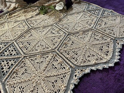 The hexagon shapes in this design use mostly simple stitches, with cables in each corner that are slightly more advanced. The hexagon shapes work up quickly.. The triangle shapes, joining and border are of a high end intermediate level.