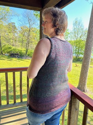 This is a simple a-line tank, designed to let the beautiful shifting colors of the yarn shine through. This is great with jeans, shorts, or skirts! The long-line silhouette is designed to move with the breeze.
