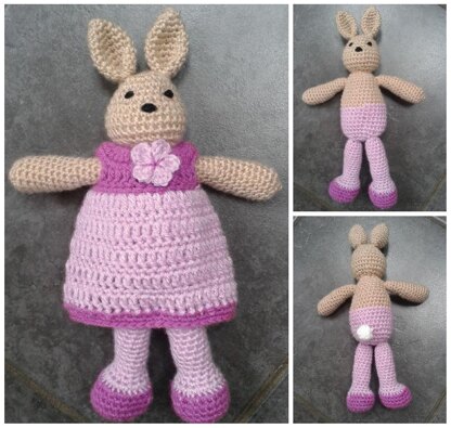 Beautiful Viola the bunny measures 10 inches from the tip of her cute little ears to the bottom of her stylish little shoes. She works up quickly using light worsted/dk yarn. With safe embroidered eyes, a cute white tail and a pretty flowery dress she is sure to be loved and a welcome addition to anyone’s home! I hope you love her as much as I do!