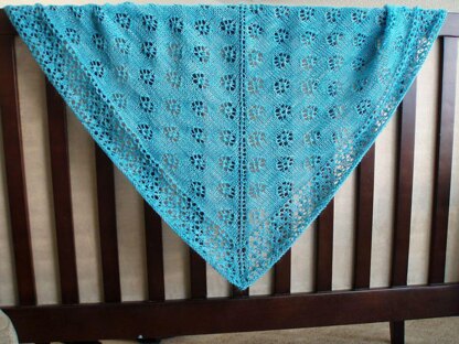 Violets Are Blue is a top-down triangle shawl with simple repetitive lace stitches and eyelet ridges. A light fingering yarn (blue shawl) produces a more lacy, open fabric for the delicate floral stitches, but any weight yarn may be used (adjust yardage accordingly). The size is easily adjusted by changing the number of repeats of either floral section.