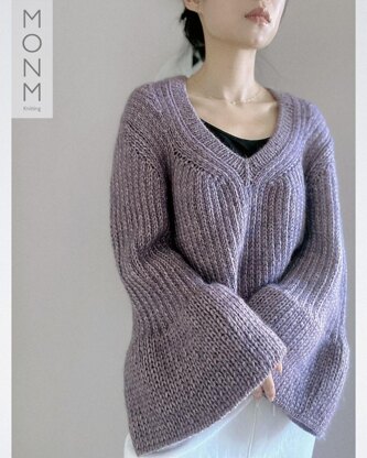Violetta sweater is a classic casual knitwear with feminine touches. Garment features slip ribbing streamlines, wide v-neck, long sleeves with statement cuffs. Violetta sweater is worked from top down in slip ribbing stitch in one piece.