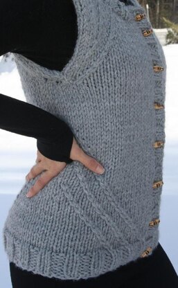 Vixen is a one piece vest up to the underarms. The only seams are the shoulders. Knit in a super-bulky yarn Vixen is quick to knit. The finished project is cozy and makes a great layering piece.