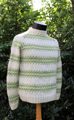 Vrold is a childs sweater (boy’s sizes). The sweater/pullover is worked from the bottom edge and up with a 2-color pattern. The sweater has a raglan yoke and sleeve construction and traditional rib edges. The pattern is made for at yarn with a gauge of 18 stitches per 10 centimeters (stockinette stitch) i.e. a yardage of approximate 90 meters per 50 grams.